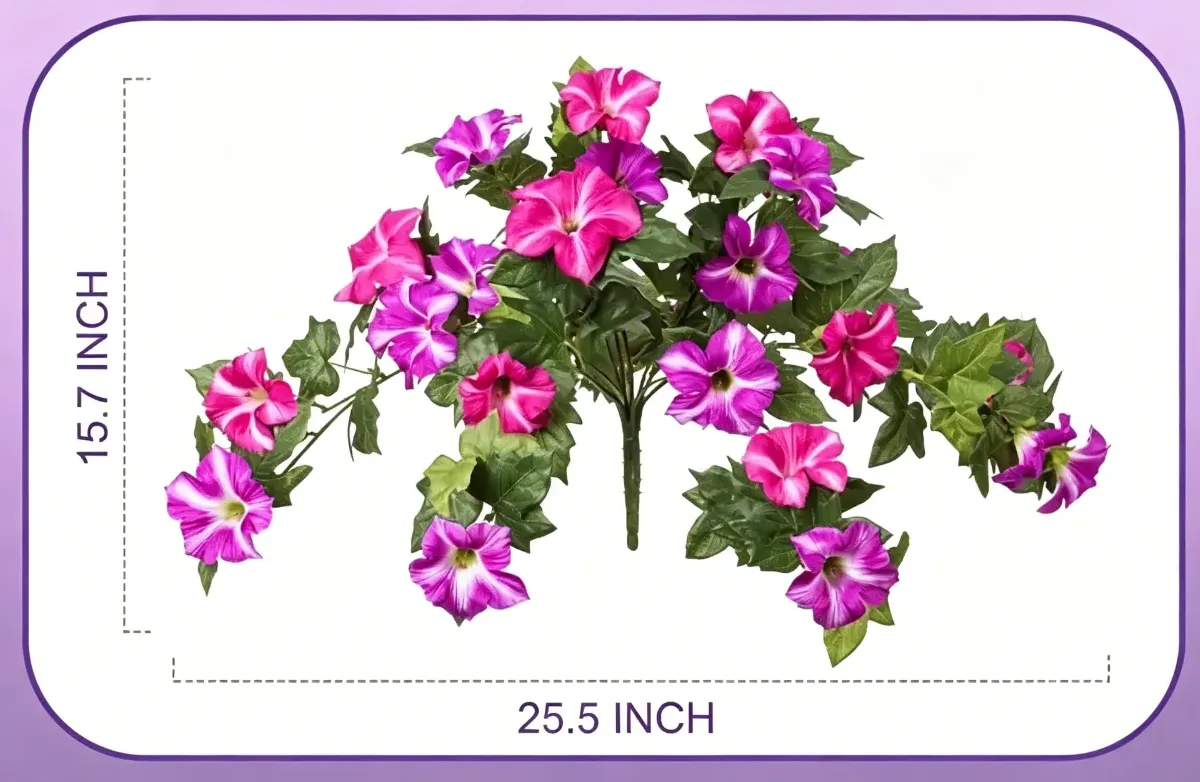 - Qualité premium : cette pétunia artificielle améliorée est fabriquée à partir de matériaux de haute qualité. Elle est résistante aux UV et ne se décolore pas facilement, garantissant une beauté durable. Chaque fleur et chaque feuille artificielle est réalisée selon un procédé spécial afin de reproduire au mieux les couleurs naturelles.